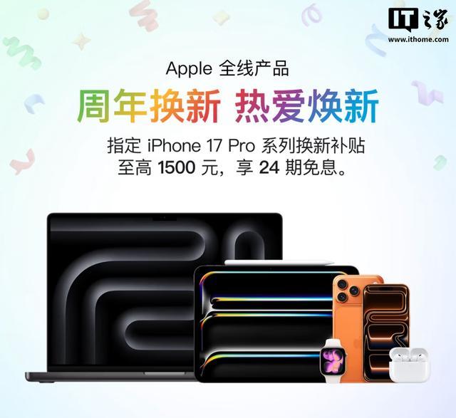 iPhone 17 Pro 系列以旧换新至高补贴 1500 元并享至高 24 期免息;